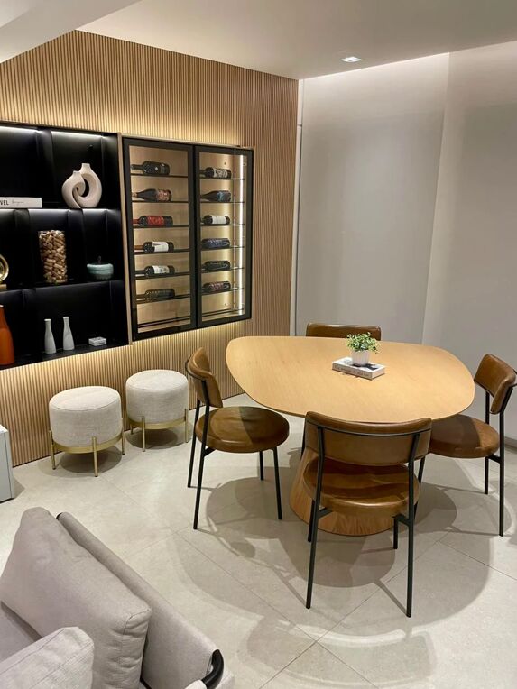 Será entregue com geladeira, forno e micro-ondas embutidos, cooktop, coifa, adega climatizada e lavadora/secadora. Todos os eletrodomésticos são novos.